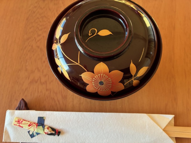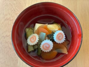 いまでは買ってきたパックのお餅でお雑煮を作るわけですが、東京のお雑煮は人参、大根、小松菜でかつお出汁。両親が若い頃は鶏肉を入れていたのではないかと思いますが、晩年はさっぱり系が好みになり、和風出汁だけになったような。気持ちの問題という感じで、ナルトを飾りました。この日だけは塗りのお椀を使ってみたりして。