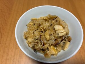 お赤飯だけでは芸がないかなと思い、筍のおこわも作ってみました。シイタケとヒジキと干しエビが入っています。なんか物足りなぁと思ったら、いつも入れている貝柱を忘れました。水でもどしてあったのに~。